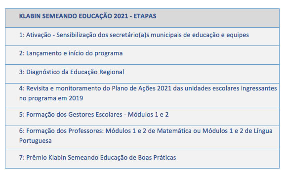O Klabin Semeando Educação, projeto da Klabin que apoia tecnicamente a educação pública municipal, especialmente na capacitação de gestores e professores dos Anos Iniciais do Ensino Fundamental, será ampliado em 2021, estendendo a cobertura atual de 3 para 13 municípios. Além de Telêmaco Borba, Ortigueira e Imbaú (todos do Paraná e integrantes desde 2019), o projeto contará agora com a participação de outros 6 municípios paranaenses (Curiúva, Reserva, Rio Branco do Ivaí, Sapopema, Tibagi e Ventania), de 3 municípios catarinenses (Otacílio Costa, Correia Pinto e Lages) e de Goiana (PE), todos territórios de atuação da empresa. A iniciativa da Klabin conta com a consultoria e a operação técnica da Interação Urbana.